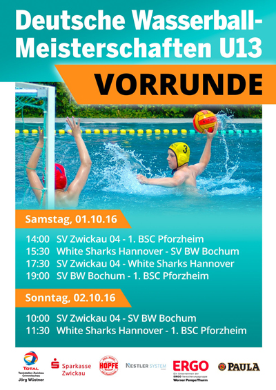 Am Wochenende spielen die Zwickauer U13-Wasserballer des SV Zwickau 04 in der Vorrunde zur deutschen Meisterschaft in der heimischen Glück Auf Schwimmhalle gegen Teams aus Hannover, Bochum und Pforzheim. Die genaue Spielansetzung kann anhängendem Bild entnommen werden.