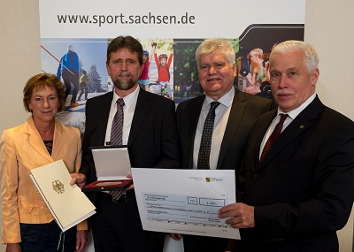 Im Bild: Übergabe der Sportplakette des Bundespräsidenten an die Vertreter des SV Zwickau 04, Christoph Kraus und Werner Beuschel, durch Angela Geyer und Dr. Michael Wilhelm