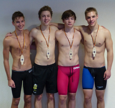 Die Goldmedaille in den Staffelwettbewerben holten unsere Mädels Cosima Münch, Loreen Jörg, Anna Rabis und Lisa Marie Komar über 4 x 50 m Lagen. Die Herren in der Besetzung Eric Schneider, Victor Zenkov, Cedric von der Reith und Bjarne Holfeld konnten sich über 4 x 50 m Lagen und 4 x 50 m Freistil jeweils über den 3. Platz freuen.
