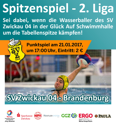 Nachdem unsere Wasserballer am vergangenen Wochenende in Brandenburg 11:11 Unentschieden gespielt haben, kommt es an diesem Samstag zum Duell um die Tabellenführung in der 2. Wasserballliga Ost. Um 17 Uhr stehen sich die SGW Brandenburg und der SV Zwickau 04 in der Glück Auf Schwimmhalle gegenüber. Natürlich haben sich unsere Jungs viel vorgenommen. Aber die Brandenburger waren am vergangenen Sonntag Pfeilschnell. Es wird also darauf ankommen, diese Konter noch besser in den Griff zu bekommen. Weiterhin werden unsere 04er einige taktische Fehler in der Verteidigung abstellen müssen, um am Ende als Sieger aus dem heimischen Becken steigen zu können. Ihr Vorteil sollte aber diesmal sein, dass sie keine Reisestrapazen haben und wieder aus den Vollen schöpfen können. Natürlich hoffen wir auch bei so einem Spitzenspiel auf eine volle Halle, die ihre Spieler unterstützt. Deshalb kommt, bei diesem Spitzenspiel und dem kalten Wetter, alle in die warme Schwimmhalle und unterstützt unser Zweitliga-Team im Kampf um die Spitze!