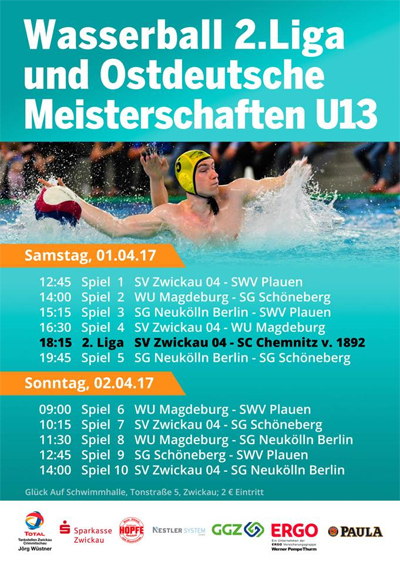 Wegen des U13-Turniers verschiebt sich die Anspielzeit des Männer-Punktspiels der 2. Liga Ost. Der Tabellendritte SV Zwickau 04 empfängt morgen, 18.15 Uhr, das Schlusslicht SC Chemnitz. Das Trainerteam kann wieder auf den kompletten Spielerkader zurückgreifen. Unter diesen Vorzeichen ist ein Sieg für die Hausherren natürlich Pflicht. Wir hoffen, dass trotz der späteren Anspielzeit, zahlreiche Zuschauer den Weg in die Schwimmhalle finden!