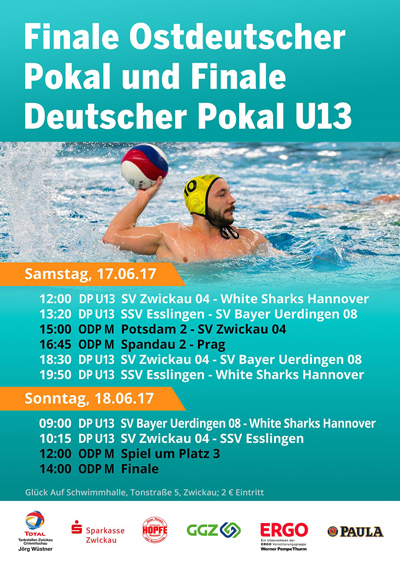 Den Auftakt macht unsere U13 am Samstag um 12:00 Uhr gegen die White Sharks Hannover. Um 15:00 Uhr findet dann schon das Halbfinale der Männer gegen Potsdam II statt. Die weiteren Ansetzungen können dem anhängenden Spielplan entnommen werden. Beide Teams des SV Zwickau 04 sind hoch motiviert, haben sich in den letzten Wochen entsprechend vorbereitet und sind fest davon überzeugt, dass mit der Hilfe des außergewöhnlichen Zwickauer Publikums Historisches möglich ist. Daher die Bitte an alle Fans – kommt in die Glück Auf Schwimmhalle und unterstützt uns!
