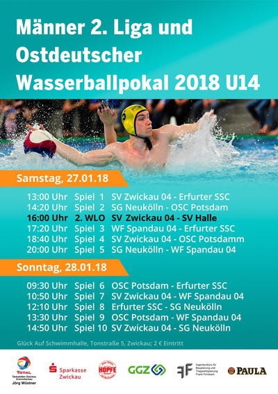 Ein ereignisreiches Wochenende wartet auf die Zwickauer Wasserballer in der Glück Auf Schwimmhalle. Schon am Samstag um 13:00 Uhr geht es los mit dem Versuch unserer U14 den Ostdeutschen Wasserballpokal zu verteidigen. Im ersten Spiel treffen sie auf den Erfurter SSC. 14:20 Uhr findet dann die Begegnung SG Neukölln - OSC Potsdam statt.