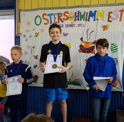 Über die 50 m Freistil sicherte er sich, ebenso wie über die 50 m Delphin und 50 m Brust, den 1. Platz, welcher wie beim Osterschwimmfest üblich durch einen Schokoladen-Osterhasen versüßt wurde.