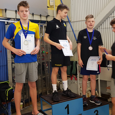 Gleich für den ersten Kracher sorgte Jeremy über 50 m Schmetterling. Mit einer Zeit von 29,91 s sicherte er sich gleich Platz 1 und natürlich eine neue Bestzeit. Er fühlte sich an dem Tag richtig stark und schwamm eine Bestzeit nach der Anderen. Über 50 m Rücken konnte er mit 31,93 s (3 s schneller als bisherige Bestzeit) und Platz 1, 100 m Rücken 1:08,91 (8 s verbessert) und Platz 1, 200 m Rücken 2:26,74 (7 s schneller) und Platz 1, 50 m Brust 35,63 (1 s unter Bestzeit) und Platz 1 sowie 200 m Brust 2:44,22 (25 s verbessert) und Platz 2 auf ganzer Linie überzeugen. Bei 6 Starts 5-mal Gold und 1-mal Silber kann sich sehen lassen. Deutschlandweit in seinem Jahrgang bedeutet das Aktuell Platzierungen unter den Top 5 (davon 2 x Platz 3, 3 x Platz 4 und 1 x Platz 5).