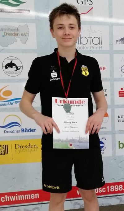 Mit 2x Gold, 4x Silber und einer weiteren erreichten D2-Kadernorm über 200 m Lagen konnte Jeremy Kunz (Jahrgang 2005) am vergangenen Wochenende in Dresden zum Frühjahrspreis voll überzeugen. Der internationale Wettkampf war mit 644 Schwimmern aus Polen, Tschechien und zahlreichen Vereinen aus ganz Deutschland sehr gut besetzt.