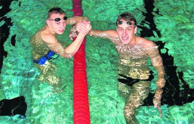 Bildtext: Die Schwimm-Asse Tim Seifert (links) und Rene Hahn vom SV 04 lieferten sich spannende Duelle. Über 50 Meter Freistil schlugen sie auf die Hundertstensekunde genau zur selben Zeit an und gratulierten sich hinterher. (Foto: Heinz Künzel)