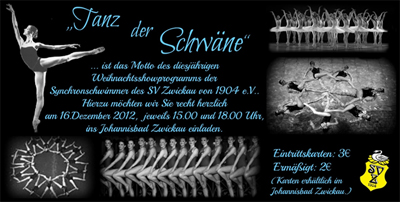 Auch in diesem Jahr werden die Synchronschwimmerinnen des Schwimmvereins 04 wieder ein Weihnachtsprogramm vorführen. Das Motto „Tanz der Schwäne“ ist an Peter Tschaikowskis „Schwanensee“ angelehnt und soll die Verbundenheit des Vereins mit der Stadt Zwickau ausdrücken. Schließlich schmückt der Schwan sowohl das Stadtwappen Zwickaus als auch das 04er-Vereinslogo.