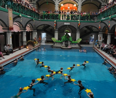 Den wahrscheinlich besten Eindruck vom Geschehen im Schwimmbecken hatten die Zuschauer auf der umlaufenden Galerie des Johannisbades. Von dort aus konnten sie vor allem die Figuren in vollem Umfang erkennen, die die Synchronschwimmerinnen in oftmals schnellem Wechsel auf die Wasseroberfläche zauberten.