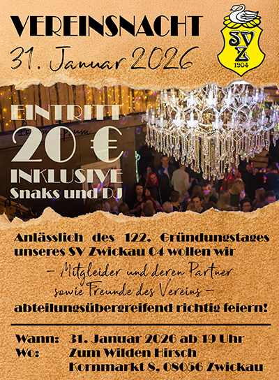Am 31. Januar 2026 findet unsere Vereinsnacht im „Wilden Hirsch“ statt. Diese Veranstaltung soll eine große Feier anlässlich unseres 122. Gründungstages sein, bei der alle Freunde des Vereins, unabhängig einer Mitgliedschaft, gern gesehene Gäste sind. Karten bekommt ihr im Vorverkauf über eure Fachwarte - wir freuen uns auf euer Kommen!